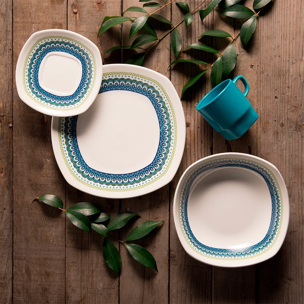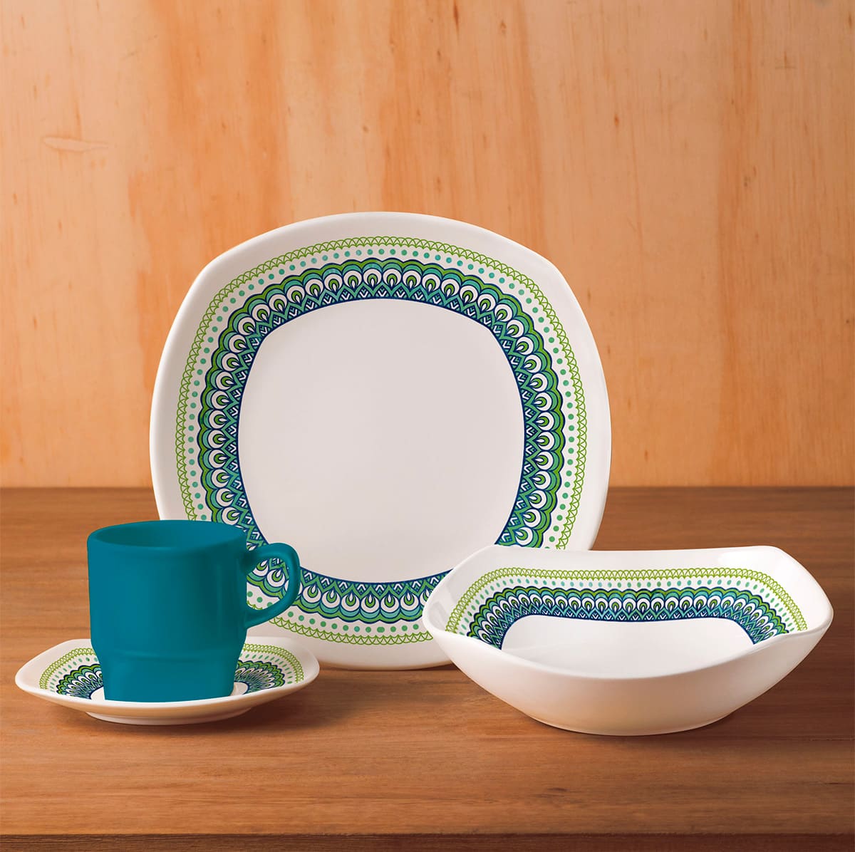 El azul es un color tranquilo, pero a la vez protagonista en el diseño de esta vajilla. La paleta utilizada acá es del azul turquesa, que incluye desde el verde claro hasta un tono más eléctrico. La simetría y los arabescos dibujan los bordes dándole relevancia al tono blanco en el centro. Las formas siguen una línea contemporánea en donde se mezclan los cuadrados con esquinas redondeadas.